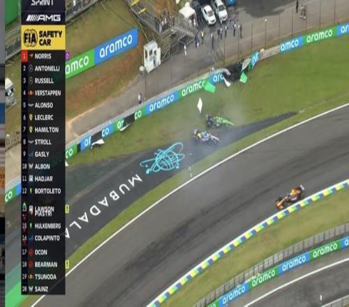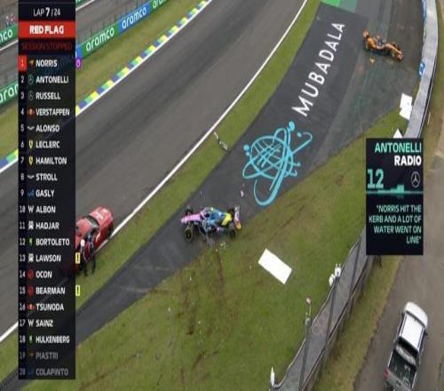 安东内利表示:诺里斯用了更多的路肩,导致很多的积水被带到赛车线上,这也间接导致了三位车手的失控退赛;