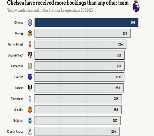 TA:切尔西自202223赛季以来吃到301张黄牌远超其他球队